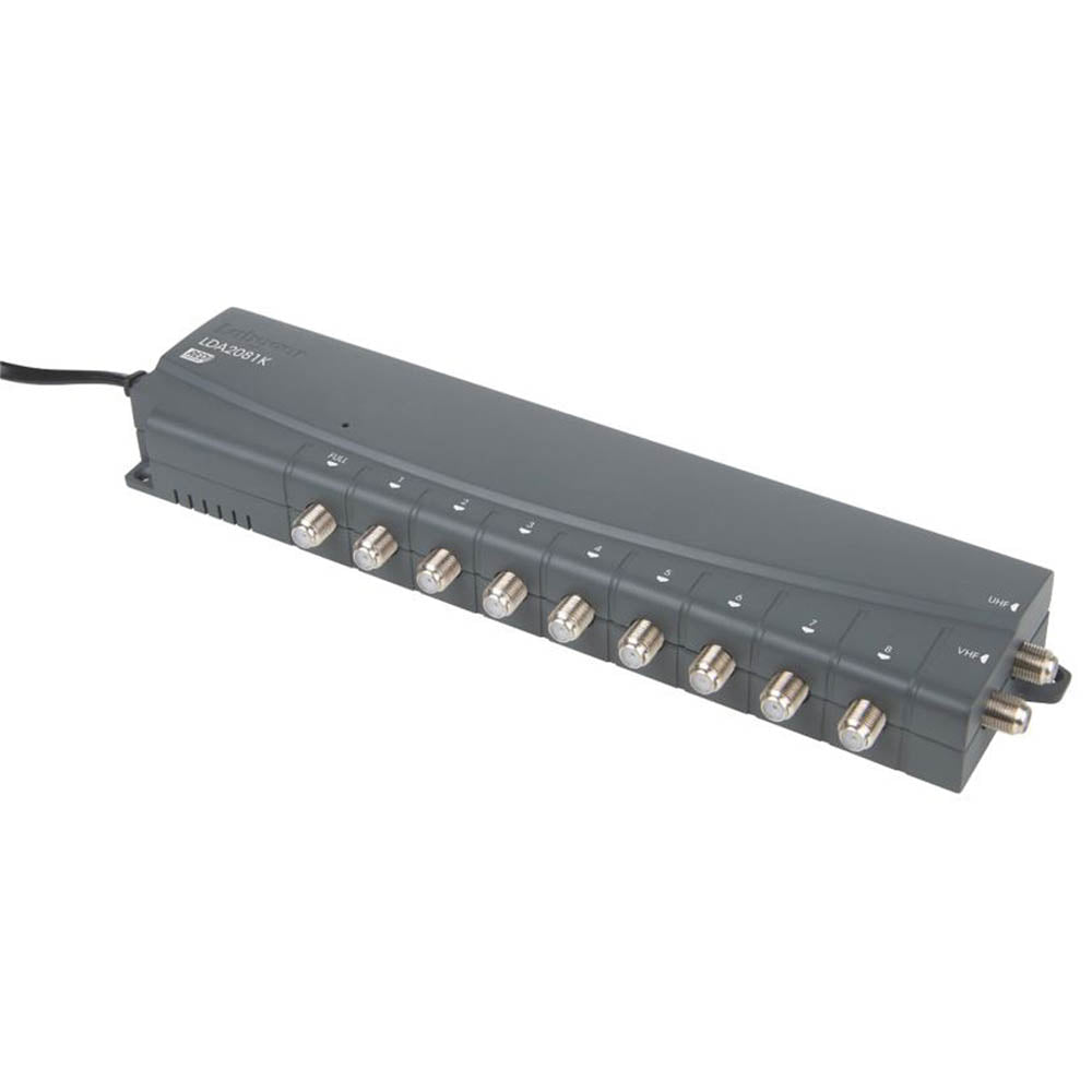 Expandable 9-way TV and radio signal amp. Full output can be split to feed an 9 points. Line-power on UHFTV input for a masthead pre-amp. Compact housing with F-connectors.